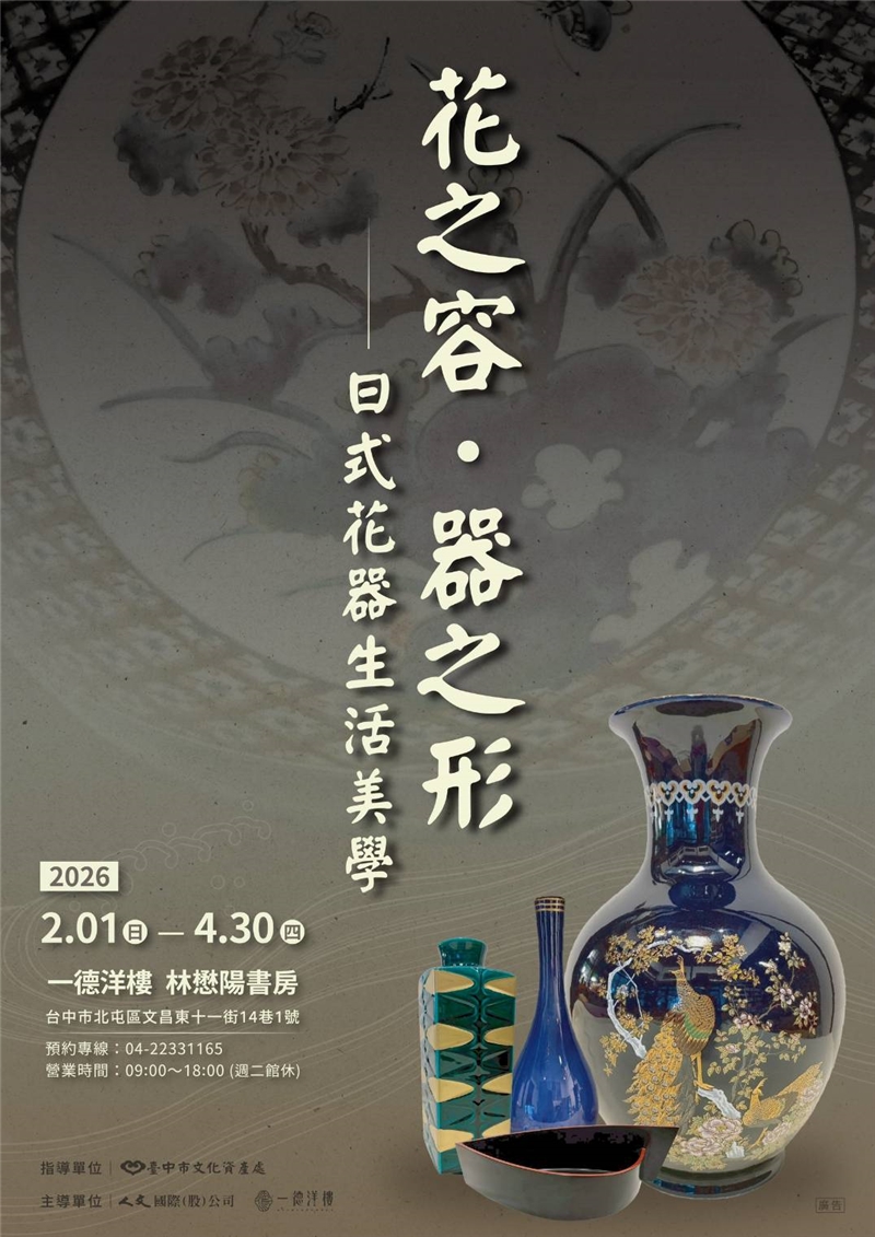 臺中市歷史建築「林懋陽故居」(一德洋樓)持續以多元展覽深化文化資產的當代價值,適逢農曆新年將至,即日起至115年4月30日推出《花之容・器之形》日式花器生活美學展,邀請民眾在春節期間走進百年歷史建築,以賞花器、看展覽的方式迎接新年,在花與器的對話中,感受歲時更迭與生活美學交織的靜謐風景。