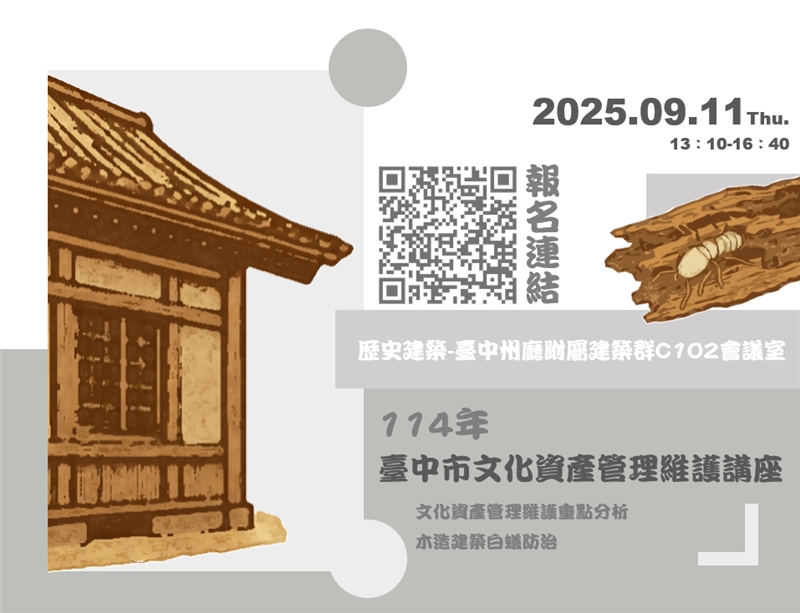 為協助文化資產的所有人、使用人及管理人在日常管理維護與巡檢工作中,及早發現潛在問題並加以預防,以避免因管理不當造成損害,同時推廣文化資產的防災與應變觀念,本處依據《古蹟管理維護辦法》第17條,規劃辦理古蹟、歷史建築等保存管理與維護相關的講座課程。誠摯歡迎各文化資產之所有人、使用人、管理人,以及對文化資產管理有興趣的相關人士報名參加。